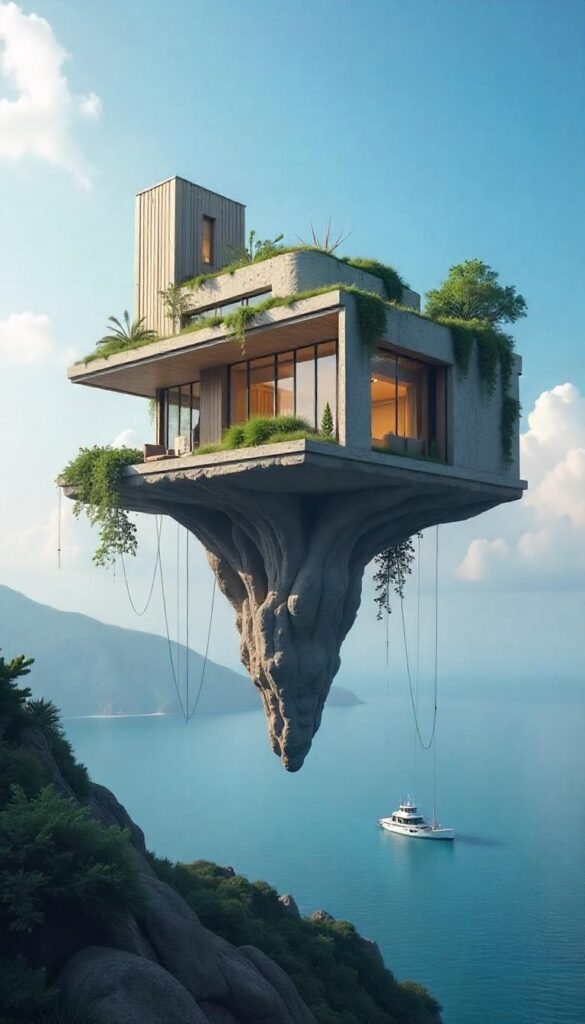 Why stay on the ground when you can build above the clouds? A multi-level floating house with glass floors, futuristic walkways, and floating gardens creates an awe-inspiring view.