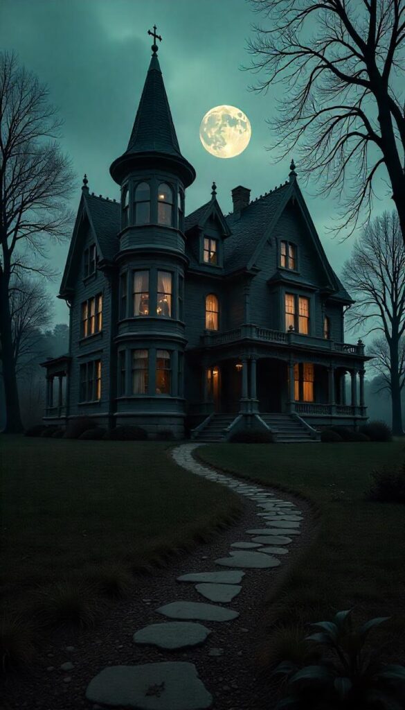 A spooky mansion with tall ceilings, secret passageways, and eerie candle-lit hallways. Add a grand library with hidden doors and a dimly lit ballroom for roleplaying fun.