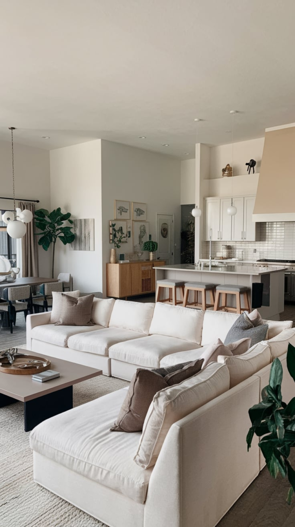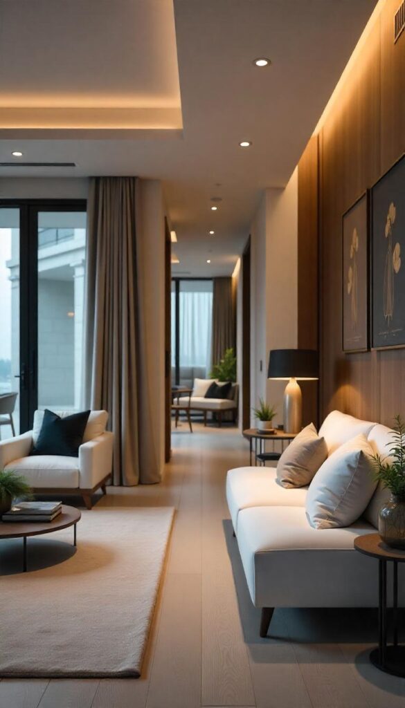 This layout thrives on simplicity and efficiency. A rectangular open space, two sleek bedrooms, and a minimalist kitchen with a bar-style dining area create an airy feel. Use large glass windows to maximize natural light.