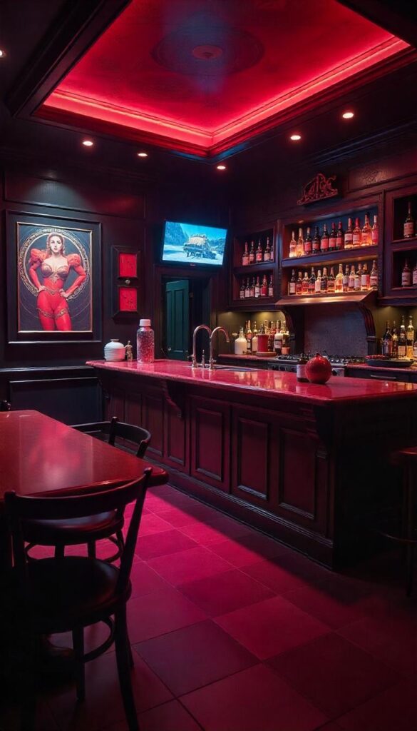 A spacious open-floor layout with a dance floor, a DJ booth, a bar area, and an infinity pool. Include a home theater and a karaoke room for extra entertainment.