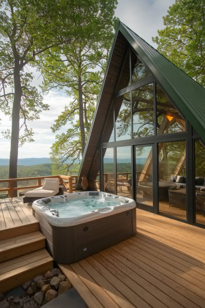 The A-frame design is perfect for mountain retreats. A triangular layout with an open living area, a loft-style bedroom, and floor-to-ceiling windows create an inviting, natural aesthetic.