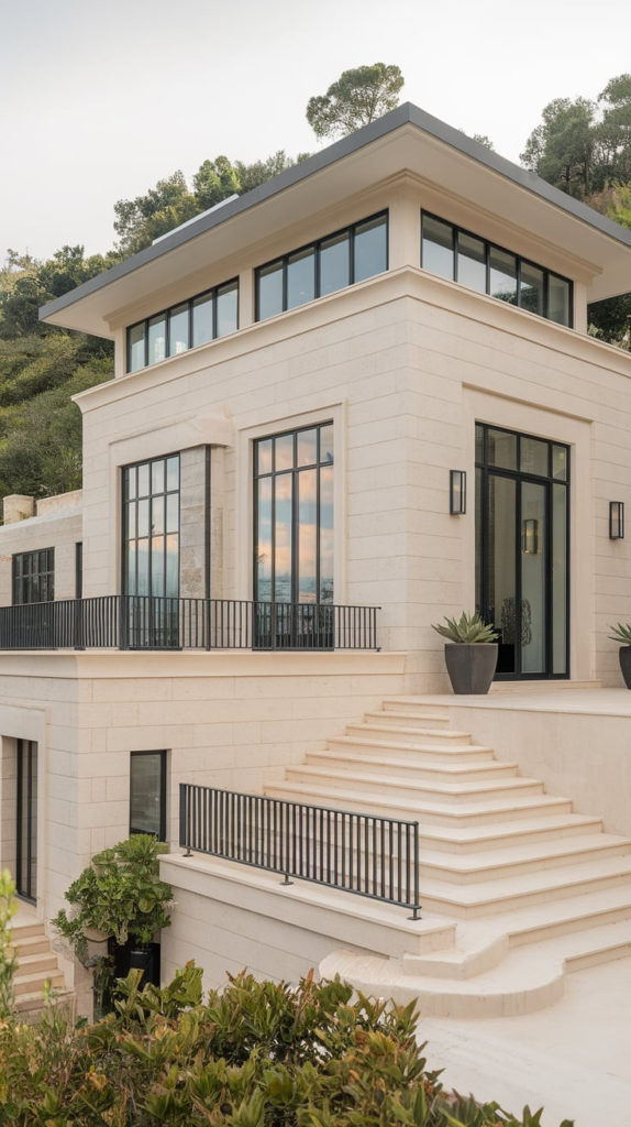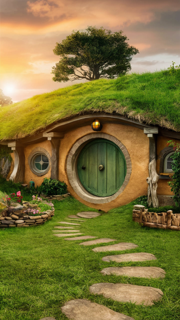Inspired by fantasy, this underground-style house has curved archways, warm earthy tones, and cozy living spaces with round doors. Add a lush garden on the rooftop for an organic look.