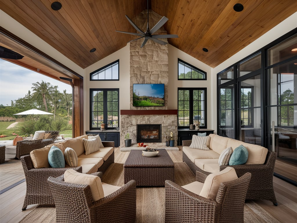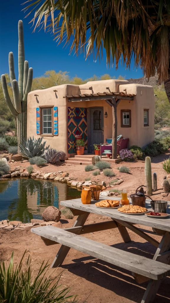 For a desert-themed house, go for a wide-open layout with earthy tones, water features, and shaded courtyards. Add a covered outdoor lounge with comfy cushions and fire pits for an inviting vibe.